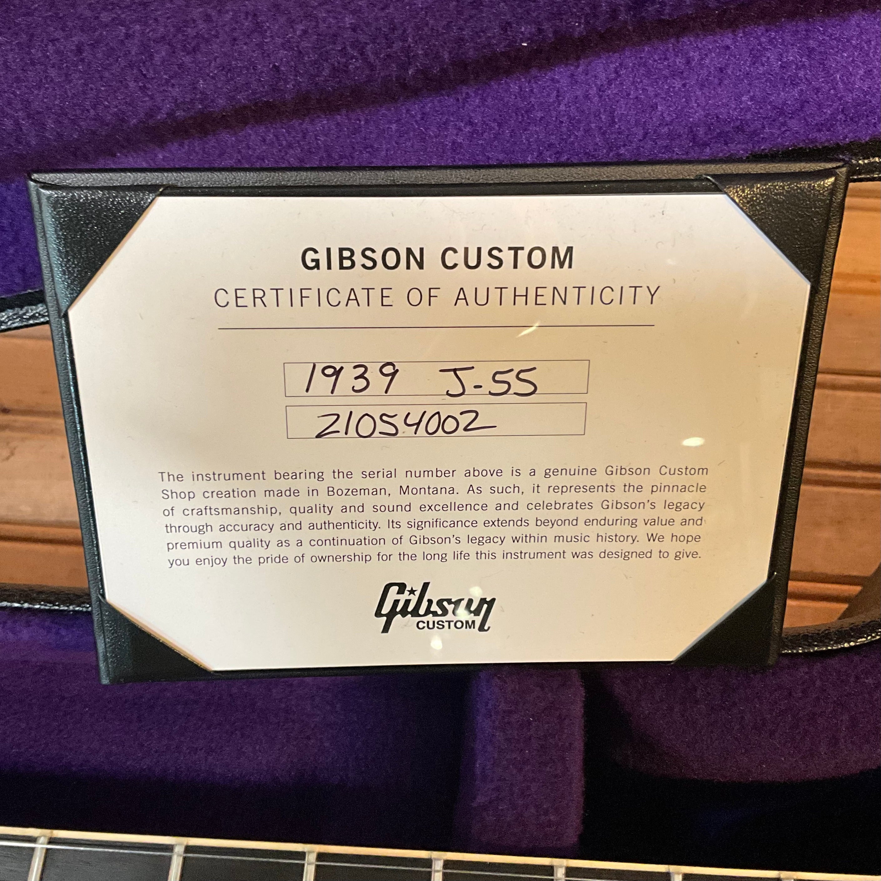 When it was released, the J-55 carried on the tradition of Gibson round-shoulder acoustic instruments. It was one of four Jumbo guitars offered by Gibson in the 1930s, becoming extremely sought after decades after its original release. The new Custom Shop 1939 J-55 features premium ebony on the fingerboard and bridge, a long-scale neck, and a thermally aged Adirondack red spruce top. Distinctive custom additions include a Moustache™ bridge, terraced fire stripe pickguard, and a wide 1.77" nut width.