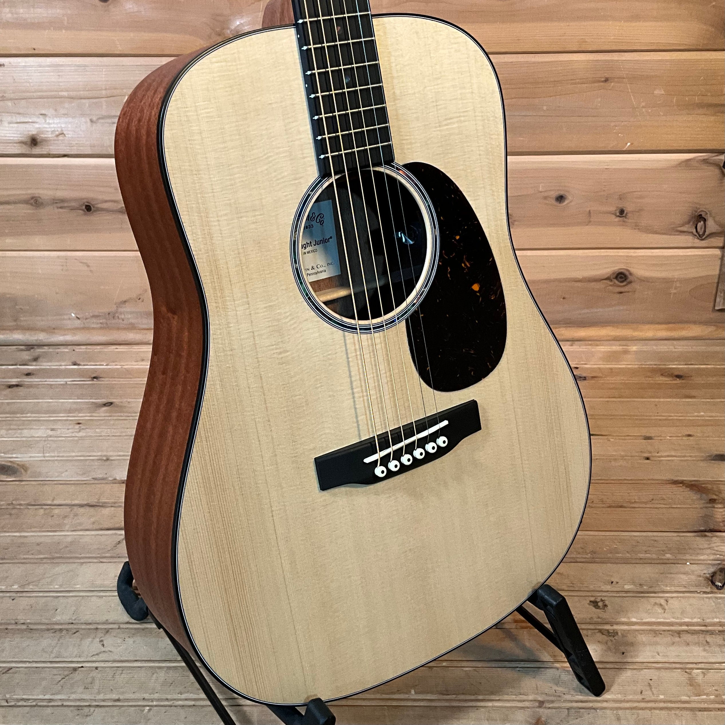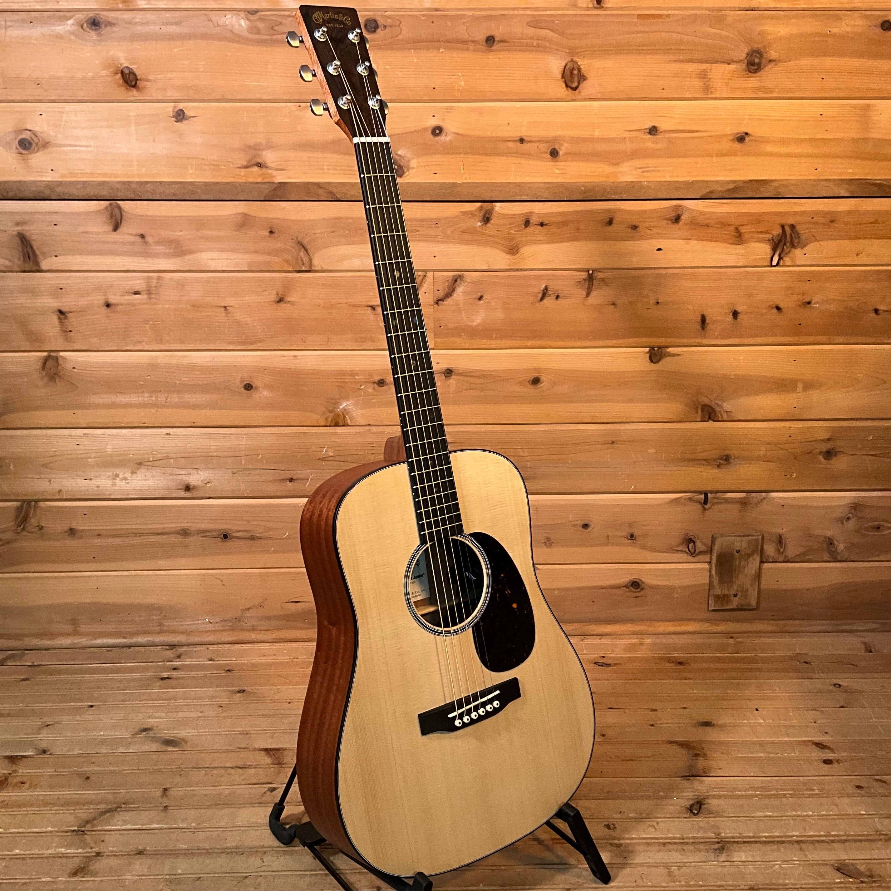 The Dreadnought Junior E is your full-scale musical companion, built to bring the soul of a vintage Martin to every adventure. This all-new Junior Series Dreadnought combines Martin's legendary craftsmanship with a road-ready size, offering the bold tone and deep resonance you'd expect from a larger guitar in a compact, travel-friendly package. Designed for wherever your music takes you, the Dreadnought Junior E delivers with its solid sapele back and sides, scalloped spruce X-bracing, and Performing Artist neck with a familiar 24.9" scale length for effortless playability. Whether you're strumming on the couch, hitting the studio, or plugging in for a live set, Martin E1 electronics with a built-in tuner and volume, tone, and phase controls ensure your sound stays clear and true. Ergonomic refinements like a gently beveled fingerboard edge and optimized string spacing make this guitar even harder to put down. Packaged with a durable softshell case, the Dreadnought Junior E is your full-scale ticket to uncompromising sound and style-wherever inspiration strikes.