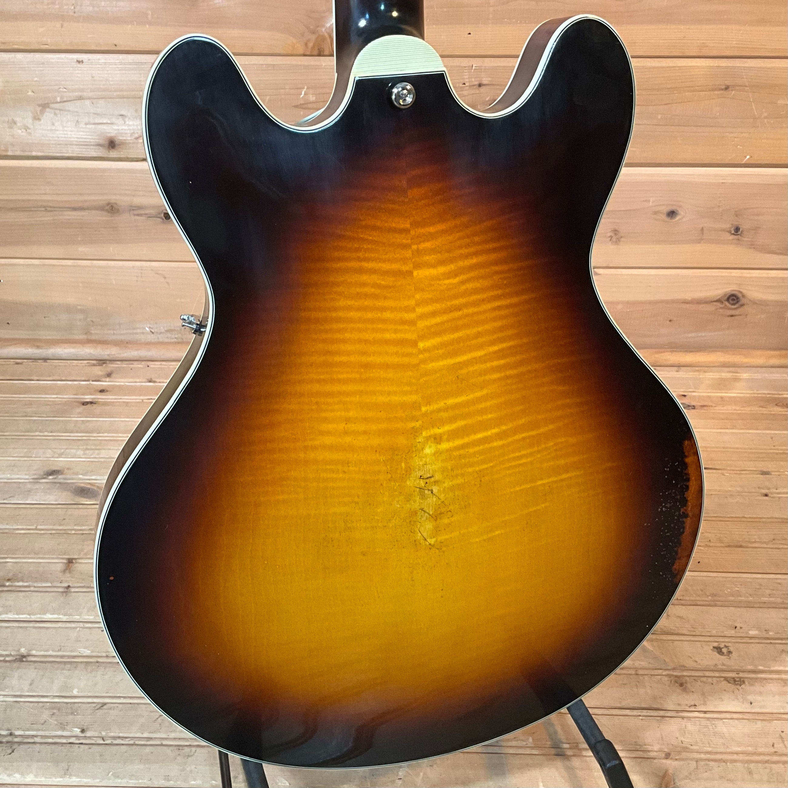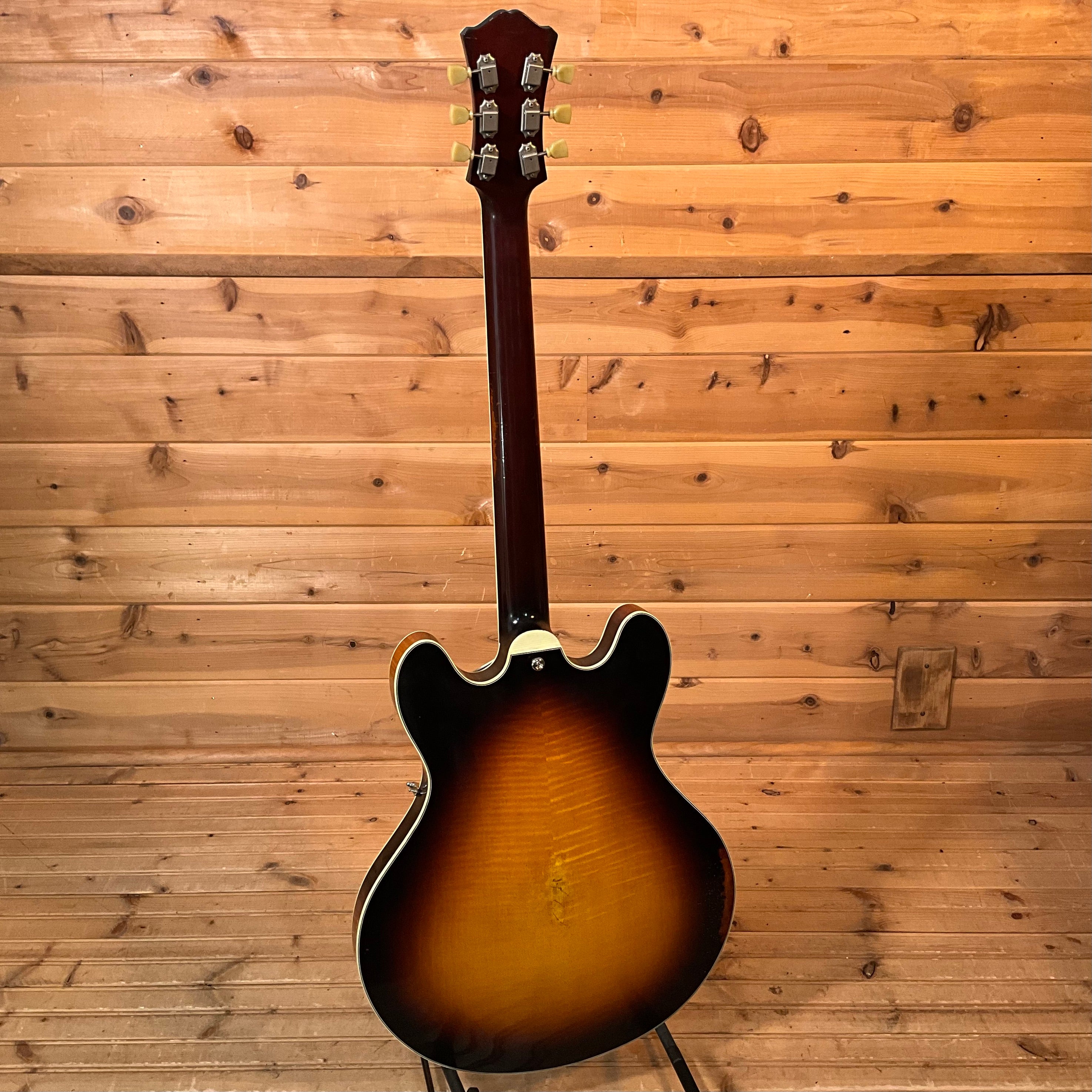 Now made in the USA for the first time in over 50 years! Since its introduction in 1961, the Epiphone Casino™ has been the choice of countless musicians including Paul McCartney, John Lennon, George Harrison, Keith Richards, Ray Davies, Dave Davies, and Paul Weller. The new Casino from the USA Epiphone Collection features a classic maple and poplar body with a Royal Tan nitrocellulose lacquer finish (nickel dogear Gibson USA P-90s) or a Vintage Sunburst nitrocellulose lacquer finish (black dogear Gibson USA P-90s). The USA Collection Epiphone Casino also features hand-wired electronics with Orange Drop® capacitors and Gibson USA P-90 dogear single-coil pickups. Featuring Gibson Strings.